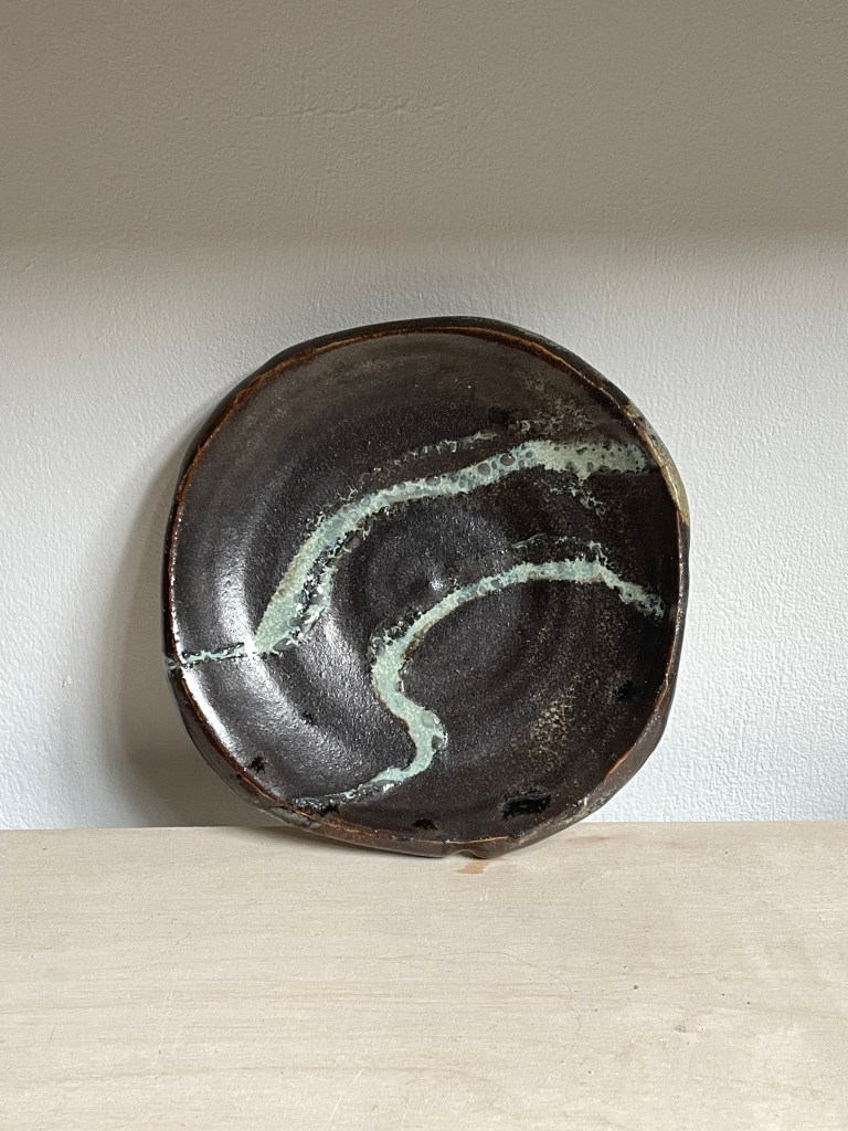 Already from that one test you have a pallet of colours and surfaces you could build a career off – and all from one triaxial! Wowwww! What’s interesting is that if you had only done this triaxial on the clay body, getting all of those murky awful browns, you might have never used the glaze again. But on the porcelain slip and black slip the same glazes look very lively. Here is a little plate I made using a glaze from this triaxial, layering the two slips.