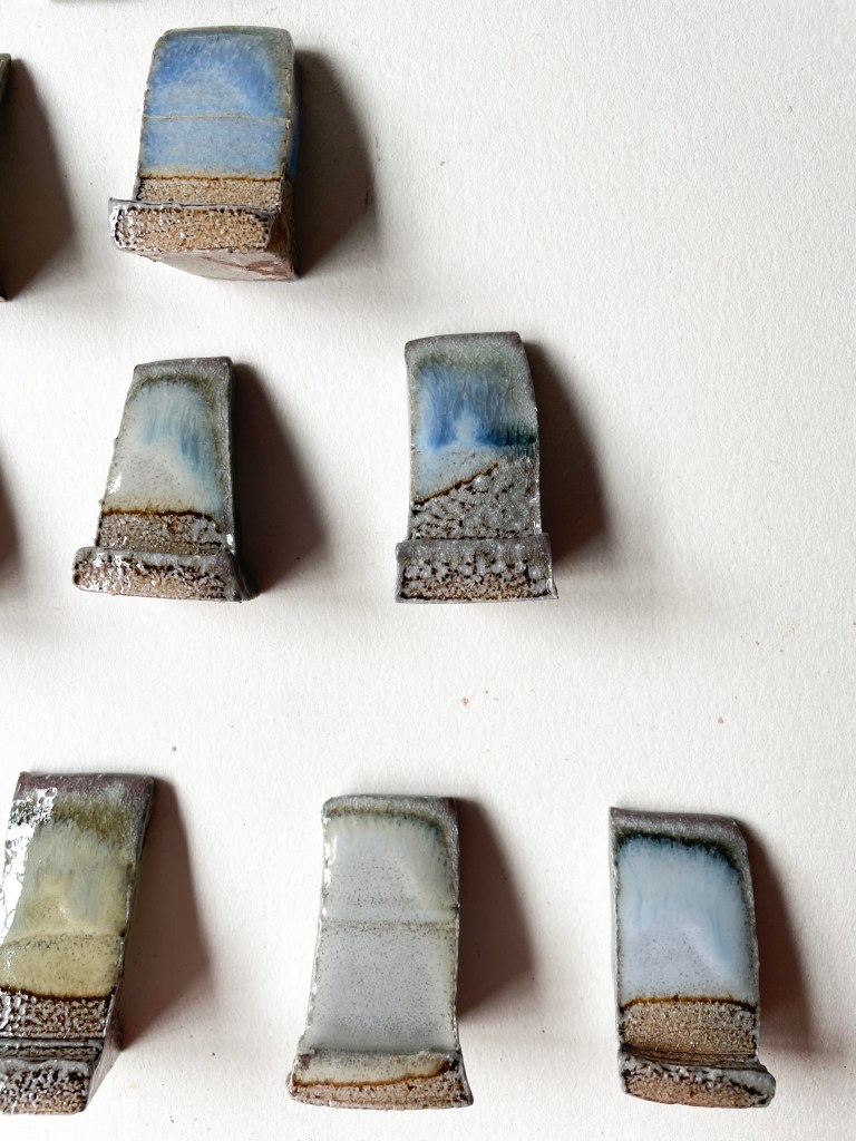Test tiles (I suggest angled tiles. Remember to reflect what your work is like in your test tiles – there is no point in throwing the test ring if you are planning on using the glaze on a hand built pot!! If you want to see how the glaze breaks and pools very clearly you can make your test tiles by simply squishing clay in the palm of your hand like the photo below)