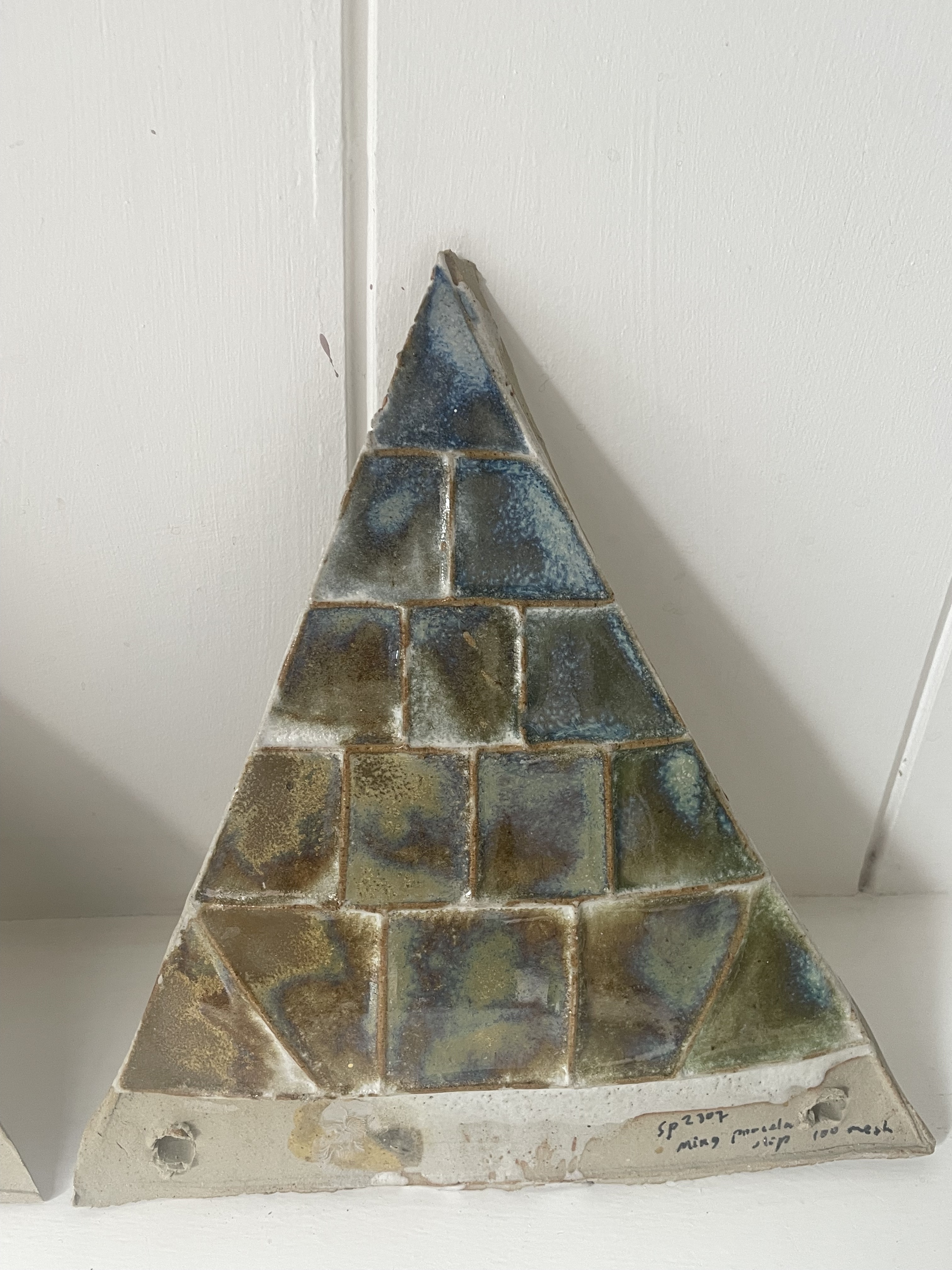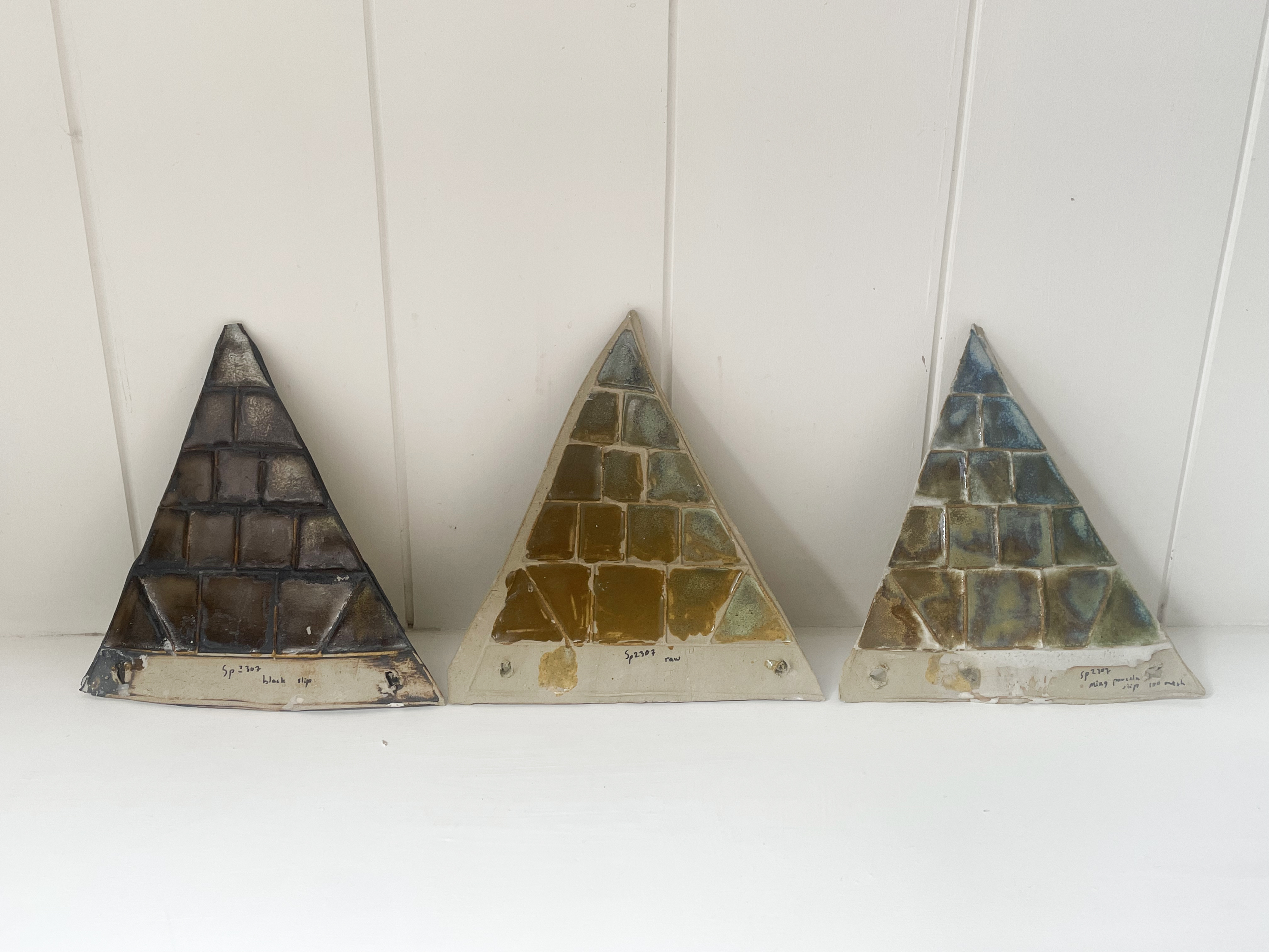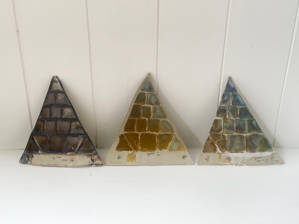 I love testing using triaxials: you prepare the three corners, and blend between them, and before you know if from three you suddenly have as many glazes as you wish! They have some limitations – for example when it comes to testing materials you are better off setting up a test such as a quadraxial, which we will leave to another time. An excellent explanation of testing materials in that way is available in Matthew Blakely’s wonderful book on rock glazes.