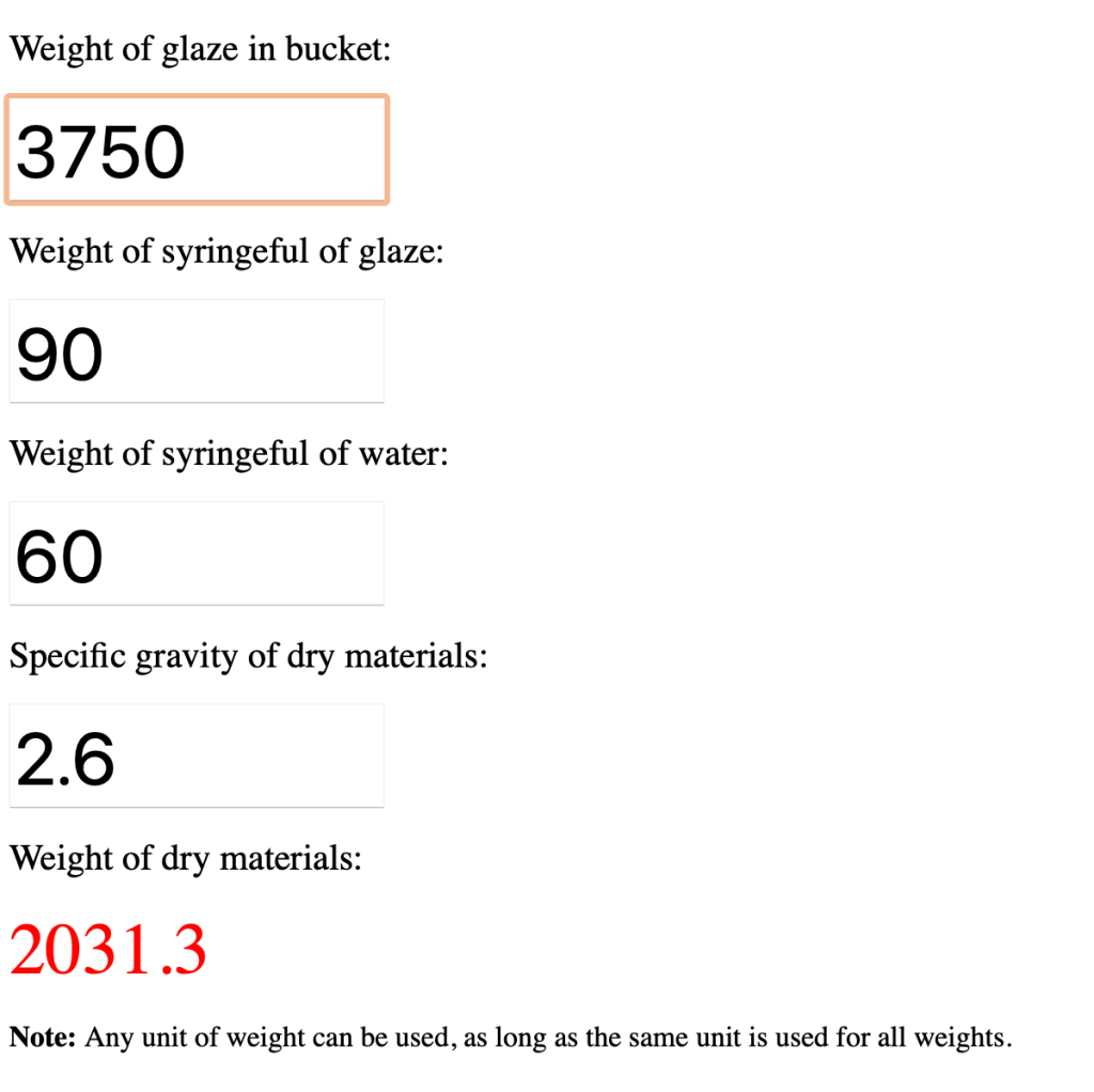 We need to enter the weight of the glaze in the bucket, the weight of a syringe full of glaze, and the weight of syringe full of water. To weigh the glaze in the bucket place an empty bucket on your scales, tare, and pour the contents in and record the measurement. Lets say it weight 3750g. Next, if we are using our trusty 60ml syringe then we already know the syringe full of water weighs 60g. So, place your syringe on your scales and hit tare. Now, draw up 60ml of glaze and return the syringe to the scales. Let’s say it weighs 90g. Now, 90g divided by 60g would give you the specific gravity of the glaze, which is 1.5 in this case. We don’t need to know that for this particular test but it is good to get in the habit of recording specific gravity so you can get more consistent glaze results between batches and adjust as necessary.