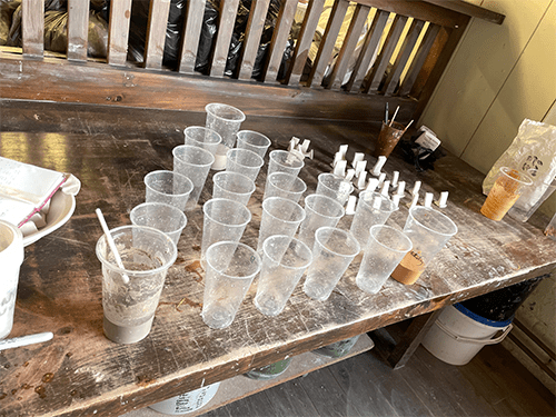 Working in rows, one glaze at a time, we are going to draw up glaze A in to the syringe, and place 20ml in each of the two nearest cups. The easiest way to do this is to draw up 50ml of glaze, and then deposit 20 each in to the two cups. We don’t draw up 40ml as there is always some air in the syringe which will throw the accuracy of the test. We then place 15ml in the next row. Then 10. Then finally 5. You’ll notice that none of glaze A is mixed in to the bottom row.
