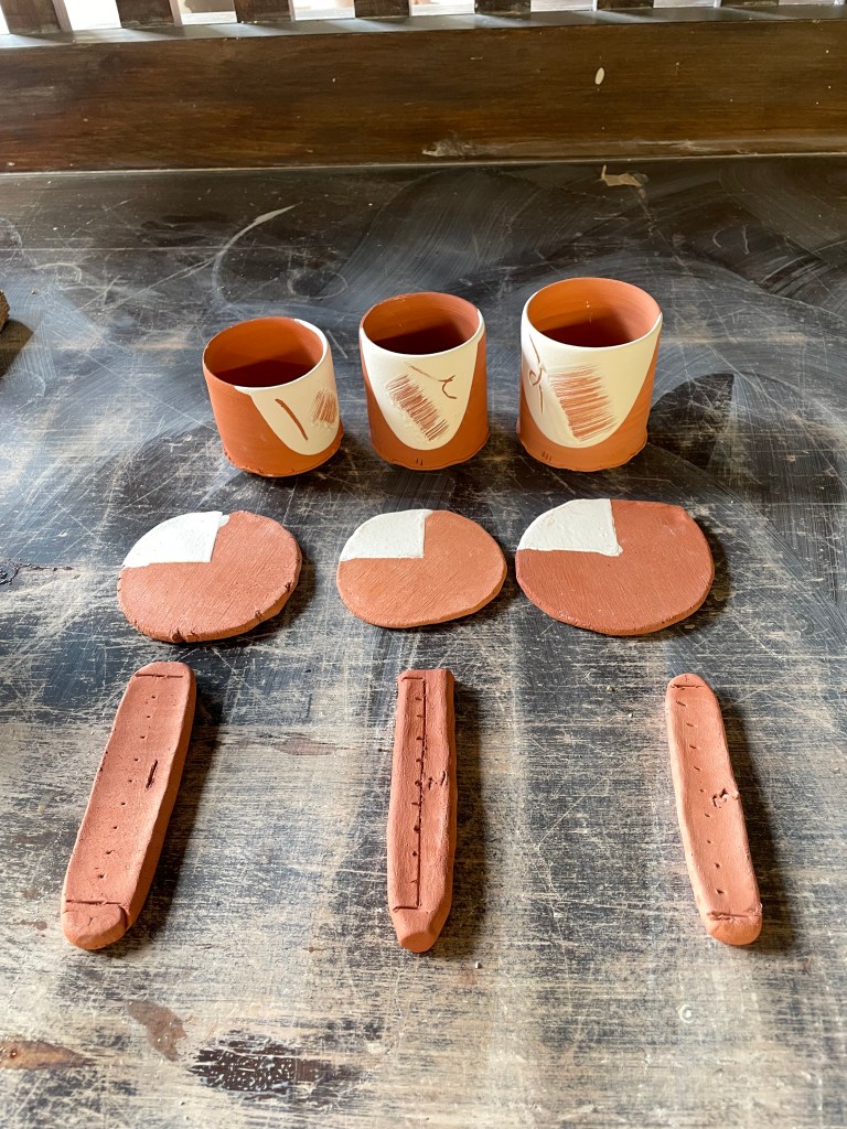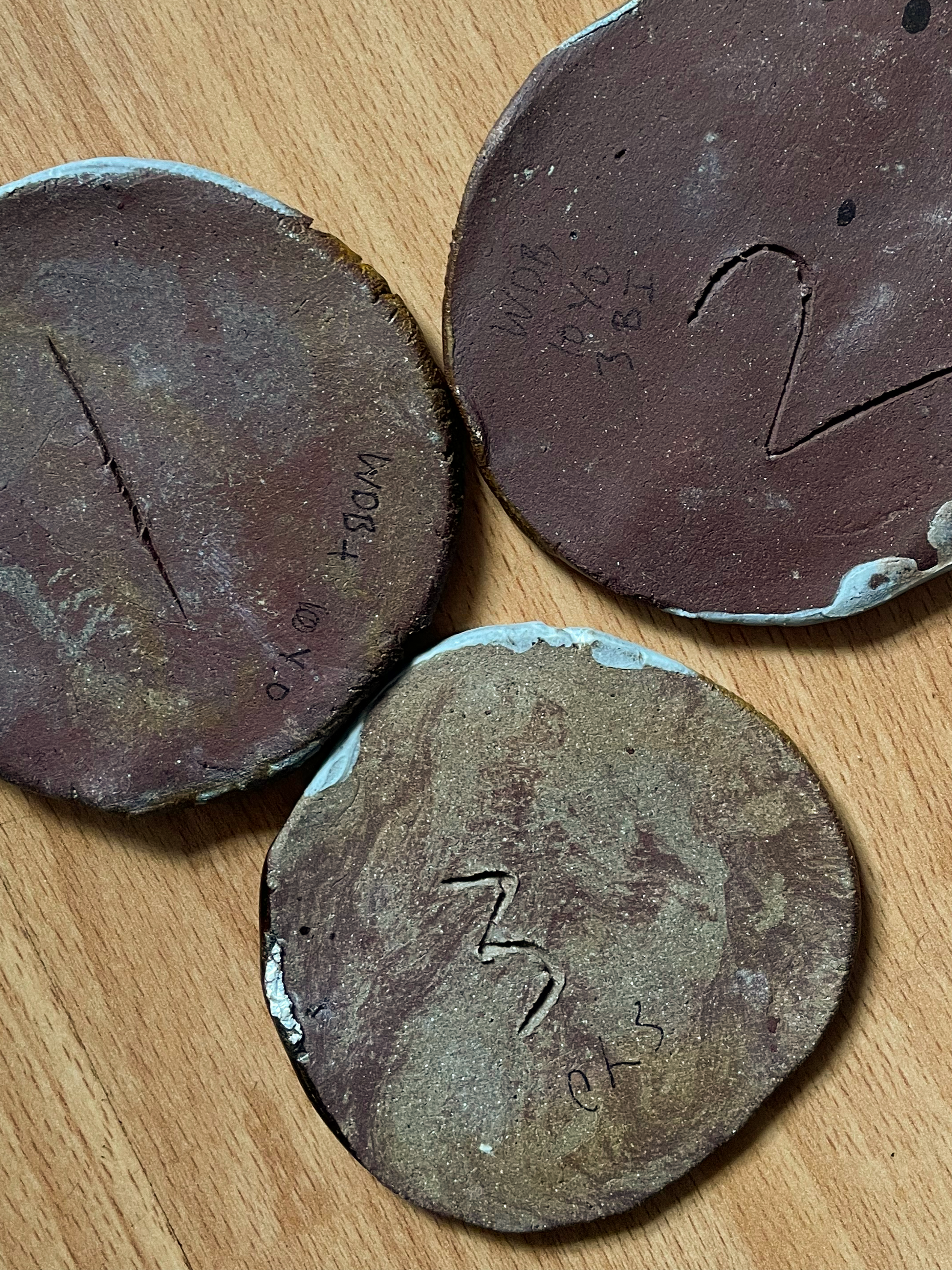 The slips and glazes were all markedly changed by the clay body, but are all very similar to each other across the three bodies. The little beakers with the sgraffito though the slip came out kinda cool – if I only I was better at sgraffito !! I feel like there could have been an interesting avenue for someone more skilled to pursue using the simple combination of a high iron body, white slip, and sgraffito.