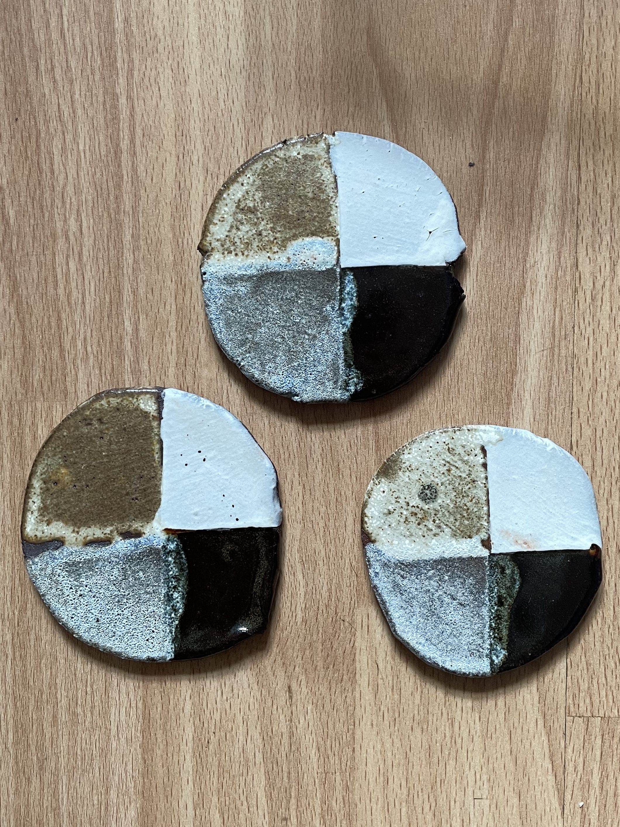 Glazes: clockwise starting in the top left, repeated on each body: Titanium ash glaze, vitreous slip, Tenmoku, lithium satin