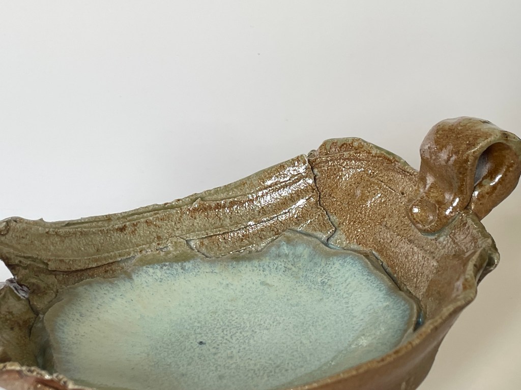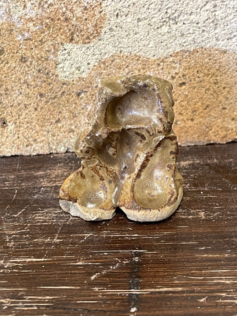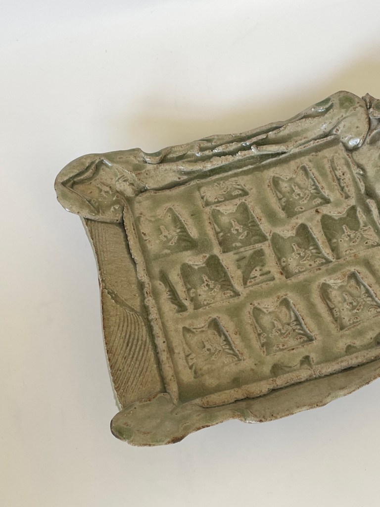 I am a huge fan of ash glazes. The most simple combinations of clay and ash, free of any industrial touch, can form some of the most beautiful glazes imaginable, and mostly all of the great glazes we admire so much from China are of this composition. One of my favourite ash glazes is based on lithium bearing feldspar, ash and clay – just look at that gorgeous pooling to pick out the cat stamp – NICE!