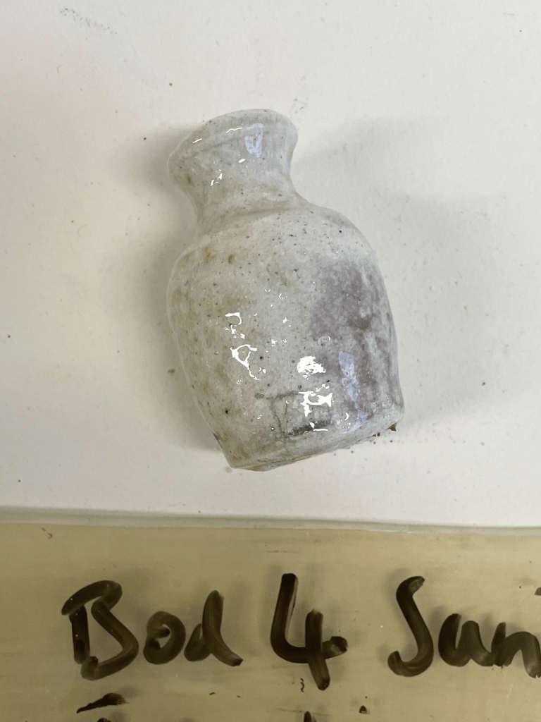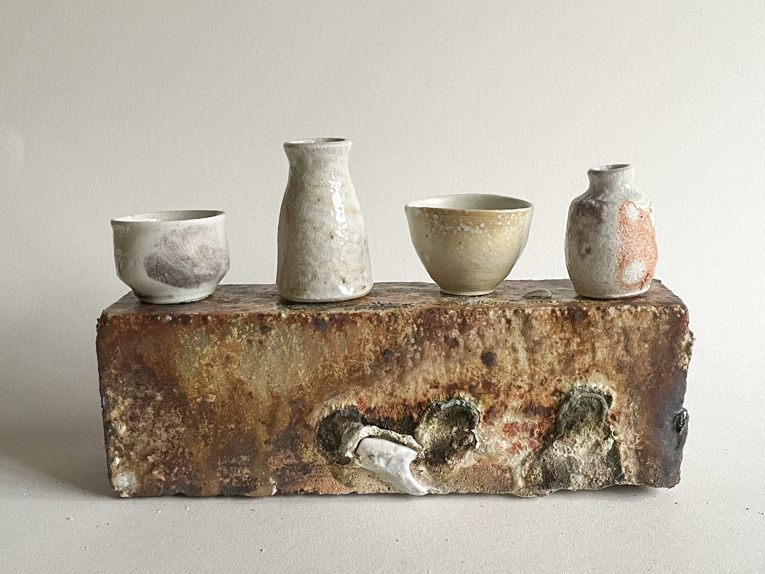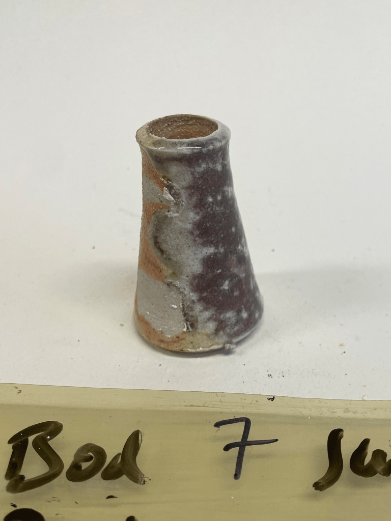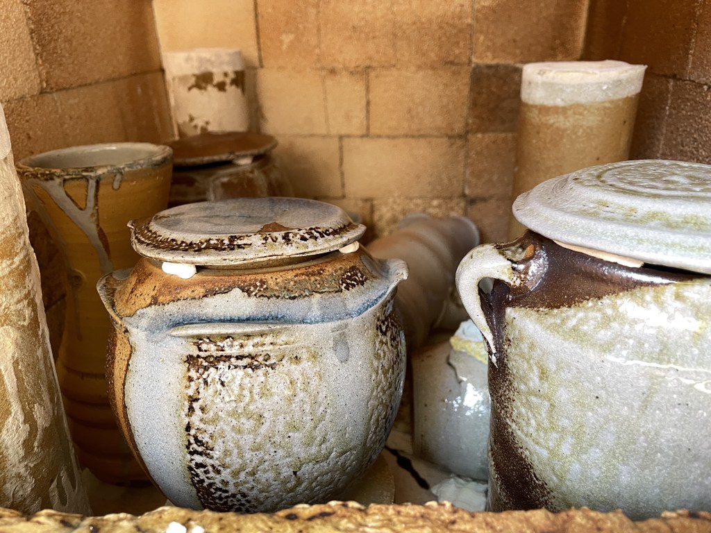 Tracing the exact starting point of this period is quite tricky, at least a couple of events in the prelude are worth mentioning. At the tail end of the first year at Clay College (summer 2023) we started doing soda firings in a large, natural gas brick kiln we built as a group under the direction of Kevin Millward. Soda firing is a form of vapour glazing. In a soda firing you put bicarbonate of soda or soda ash in to the kiln at very high temperatures. The sodium volatilises and is immensely unstable and so is “searching” for something to hang on to so to speak. The body of the clay surfaces has the building blocks of stability and so it bonds with the alumina and silica and forms a glass of very simple composition.