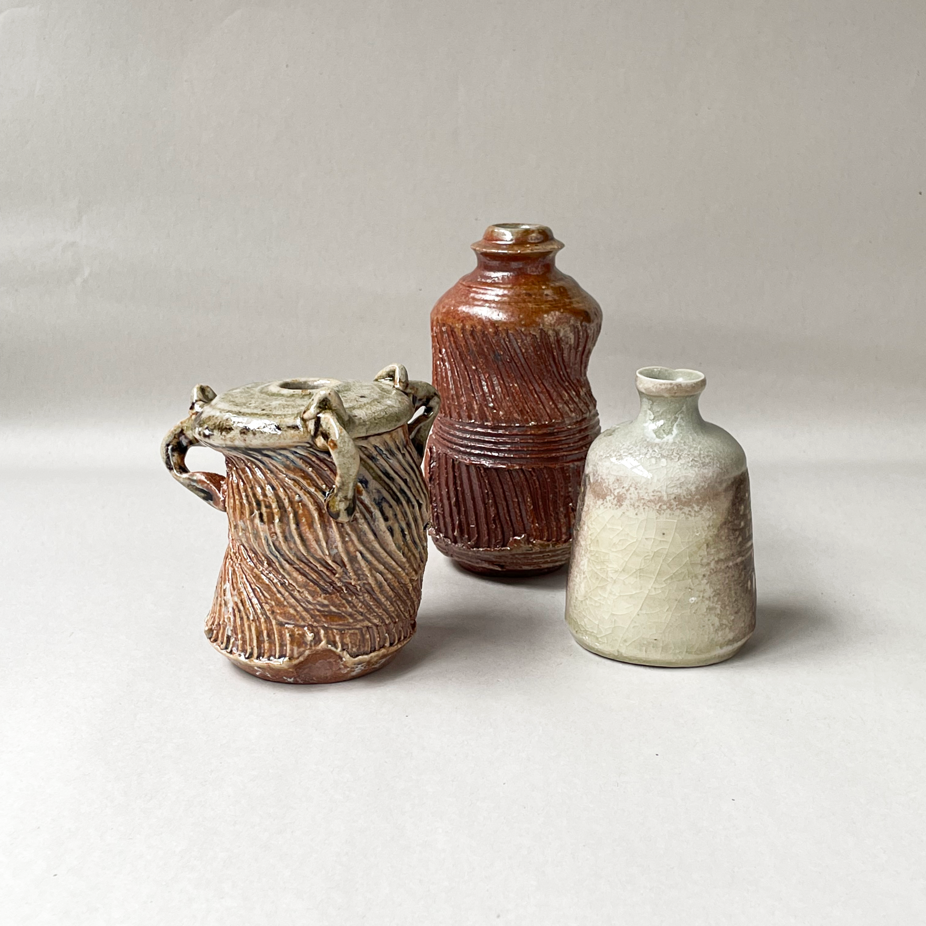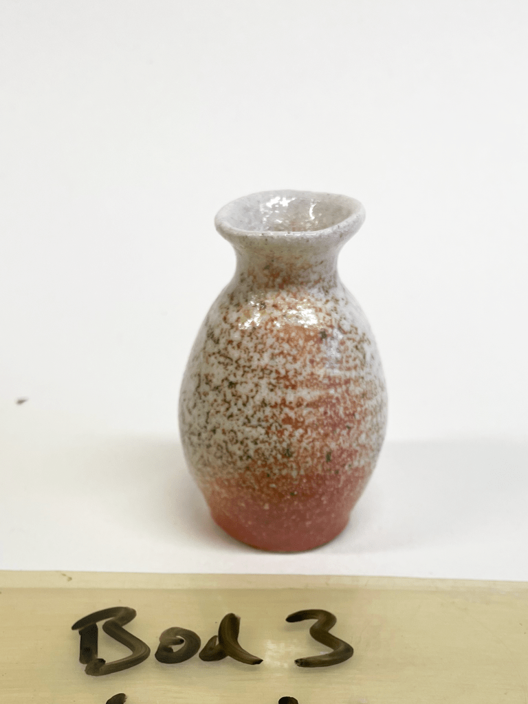 Then I came across the work of Gail Nichols, also soda fired, and yet unrecognisable when compared to anything that was coming out of the college kiln. In our firings we had been delivering the soda in liquid form using a weed sprayer, but after searching some articles online I found that Gail delivered the soda in solid form, not dissolved in liquid. A small test kiln happened to be built at college as part of a firing course for the general public and so a perfect opportunity to try the solid method of delivery presented itself, and this we did in the summer of 2023. The results were much better than the sprayed soda kiln but were still not that interesting, and so with college then getting back to the usual routine of projects, soda firing was forgotten about for a little while.